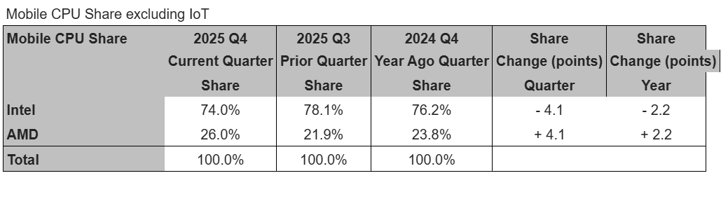 Shipments of x86 processors dropped from the third to the fourth quarter of 2025, as Intel’s supply constraints reined in PC processor shipments and helped AMD, especially in the mobile market.