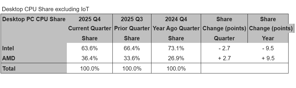 “We think the PC CPUs’ growth was in line with seasonal buying behavior, albeit a bit low,” Jon Peddie, president of JPR, said in a note. “The influence of the up-again, down-again tariffs, and Microsoft’s withdrawal from support of the 2016 Windows 10, also had an effect. We expect Q1’26 to be down due to memory constraints and higher process.”